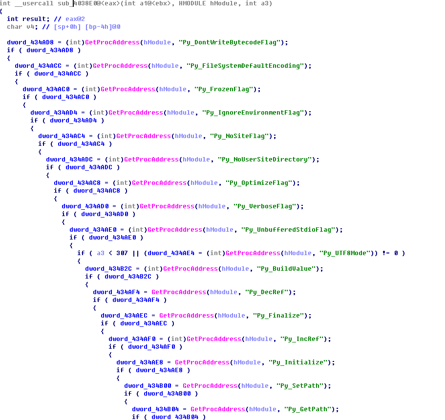해당 정보에는 C/C++로 나오지만 실제 해당 파일은 PyInstaller로 만들어진 exe 파일이다. 따라서, 악성파일에서 사용할 라이브러리를 불러오는 부분이 존재한다. 또한, 악성파일에서 사용할 파이썬 라이브러리들을 불러오기 위한 함수들도 GetProcAddress로 불러와 사용한다. 굉장한 스파게티 코드로 짜여져 있는 것을 볼 수 있다.