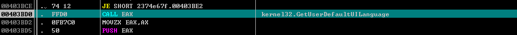 tmp 파일 생성 뒤에는 PC가 사용하는 언어 종류를 탈취한다. 해당 분석 시스템에서는 한국어로 설정되어 있었기 때문에 0x412 를 반환하는 것을 볼 수 있다.