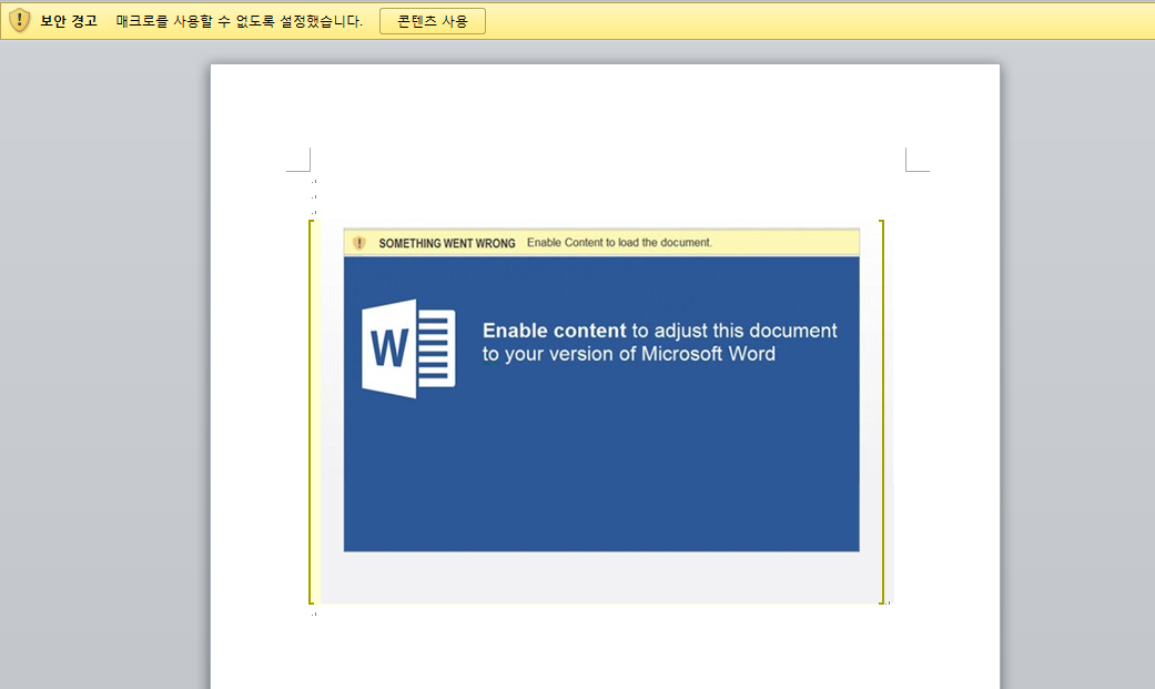 실행시 "콘텐츠 사용" 버튼을 유도하는 이미지가 나타난다. 해당 행위는 피해자가 콘텐츠 사용을 버튼을 누르게 함으로써 악성 문서 내에 존재하는 매크로를 실행시키기 위한 목적을 가진다.