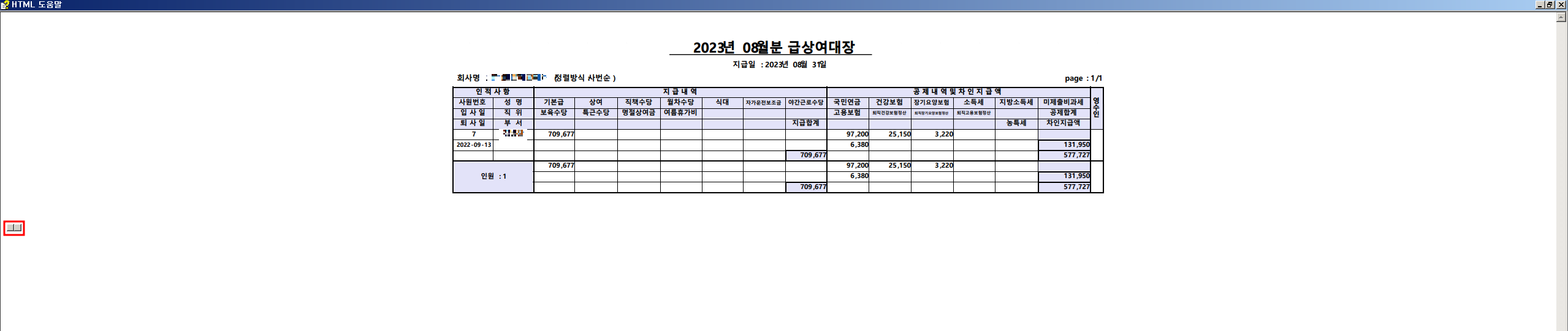 먼저, 악성코드는 특정 회사의 08월 급상여대장 파일로 위장하고 있다.CHM 파일 열람시 아래 그림과 같은 화면이 나타난다. 아마 해당 악성코드는 특정 회사를 타겟팅하여 유포된 것으로 보여진다. 해당 CHM 악성코드는 실행시 자동으로 내부적으로 포함된 powershell 코드를 실행한다. 또한, 왼쪽 아래의 버튼을 클릭할 시에도 함수가 호출되며 powershell 코드가 실행된다. (아마도 해당 버튼은 테스트용도 등으로 보여진다.)