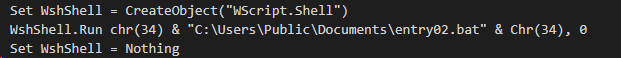 entry01.vbs 코드는 아래와 같다. 행위로는 WScript.Shell을 호출해 entry02.bat 을 실행하는 역할을 한다.