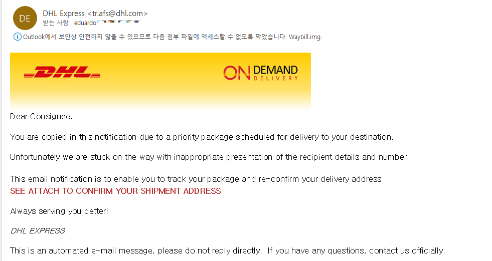 또한 동일 업체의 다른 임직원에게 스피어피싱 공격이 수행된 정황도 포착하였다. 정황상 같은 공격자의 수행인 것으로 보여지며, 해당 이메일은 dhl 으로 위장하고 있다.