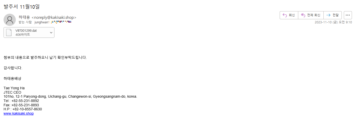 발신된 이메일은 "하태용" 이라는 특정인으로 위장하고 있고, VBT001299.dat 의 첨부파일을 첨부하고있다. 내용에서는 "첨부의 내용으로 발주하오니 납기 확인부탁드립니다." 라고 말하며 첨부파일의 열람을 유도한다.