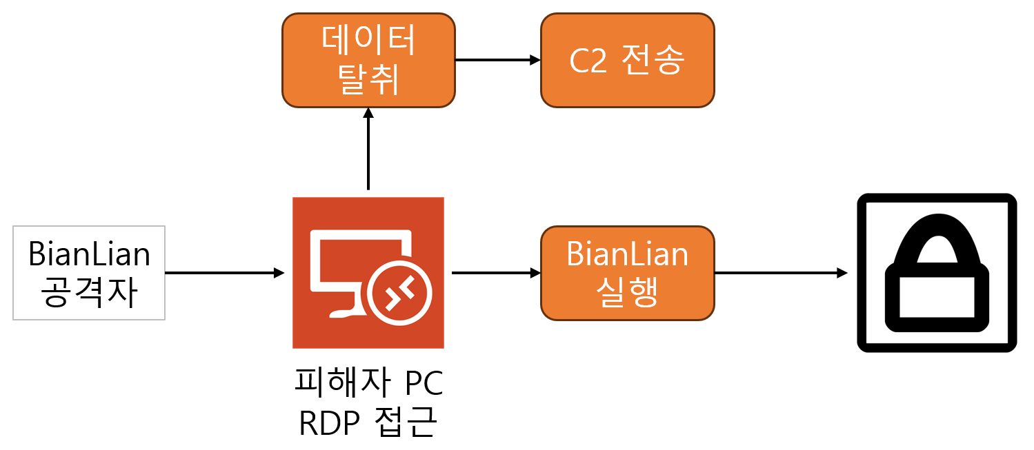 아래 도식도는 BianLian 랜섬웨어의 수행을 나타낸다. BianLian 랜섬웨어는 RDP를 통해 피해자 PC에 접근하며 피해자 PC에 접근하면 데이터를 탈취하고 해당 데이터를 C2로 전송하는 것으로 보여진다. 이후 BianLian을 실행해 피해자 PC의 파일들을 암호화한다.
