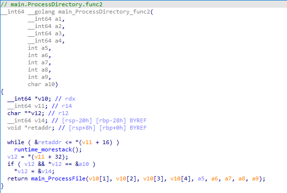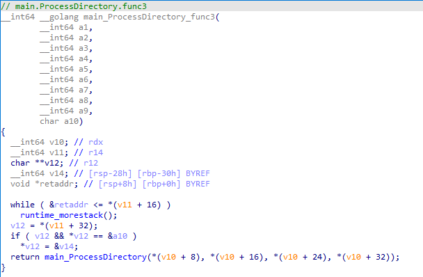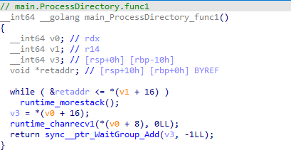 이후 드라이브의 디렉토리에서 파일을 스캔하는 등의 행위를 수행하는데, 각각 main_ProcessDirectory_func1(), main_ProcessDirectory_func2(), main_ProcessDirectory_func3() 를 사용한다.