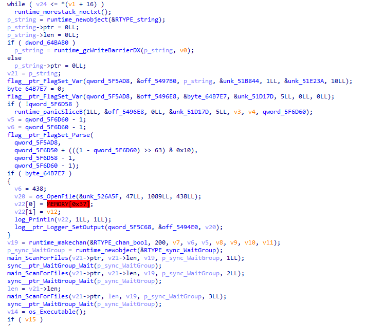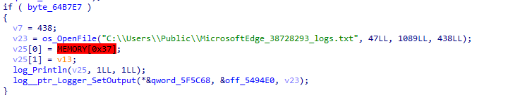 아래 그림은 BianLian 랜섬웨어의 메인 함수이다. 특정 값(byte_64B7E7)이 설정될 경우, 피해 PC의 Public 폴더 아래에 MicrosoftEdge_38728293_logs.txt 파일을 생성하고, 메모리의 값을 로그로 남긴다. 해당 루틴의 목적은 정확히 확인되지는 않았지만, 피해자 정보 식별등에 사용될 것으로 추측된다.