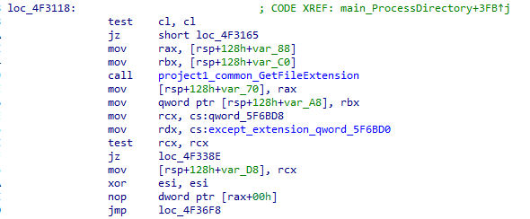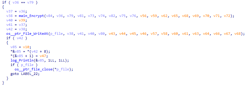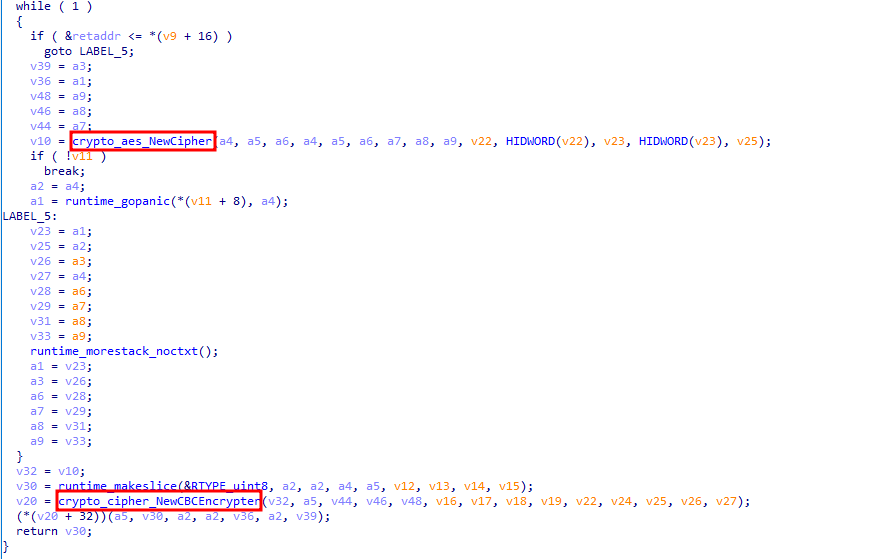 파일 암호화에 ProcessDirectory_func2() 함수가 사용된다. 암호화에 앞서 가져온 파일의 확장자가 무엇인지를 확인하며, 암호화 대상 확장자 및 암호화 제외 확장자가 아니면 암호화를 수행한다. 파일 암호화는 main_Encrypt() 함수가 암호화 루틴으로 수행되며 해당 함수 내부에서 AES-CBC 형태의 암호화 알고리즘을 사용해 파일을 암호화한다.