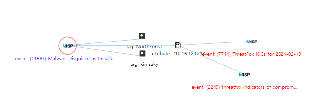 관련해서 개인적으로 운영하고 있는 MISP(Malware Information Sharing Platform) 서버에 타 이벤트와 관련된 지표가 있을지 궁금해서 지표를 엮어봤는데 아래와 같이 관련 지표가 나타났다.
