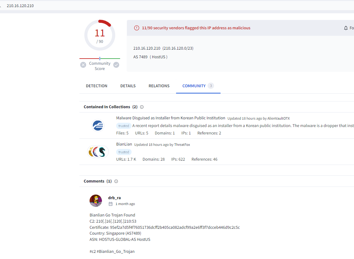 해당 IP는 싱가폴의 IP인 것으로 보여지며 VirusTotal에서 관련된 정보를 찾아보니 BianLian 랜섬웨어와도 연관이 되었었던 것으로 나타났다.