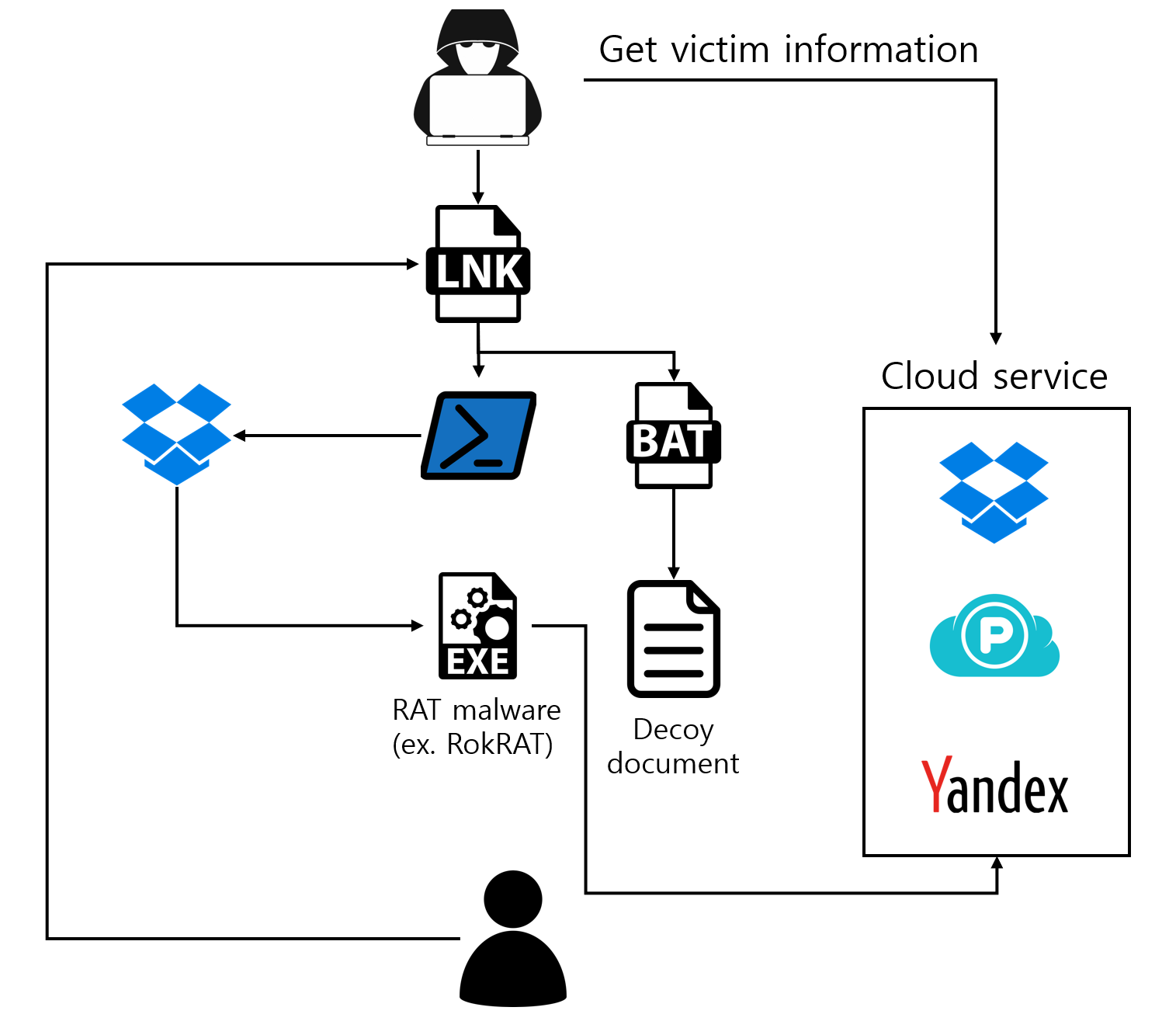 피해자가 lnk 파일을 실행할 경우, lnk 파일 내부에 존재하는 파워쉘 코드, bat 파일이 각각 생성된다. 동시에 각기 실행되며 파워쉘 코드 및 bat 파일을 이용해 lnk 파일 내부 값을 파싱해 위장 문서 생성, dropbox 등 cloud 저장소 서비스를 이용해 RAT 악성코드 등 추가 악성코드를 피해자 PC에 다운로드하고 실행한다.