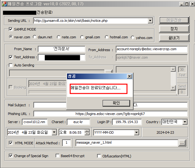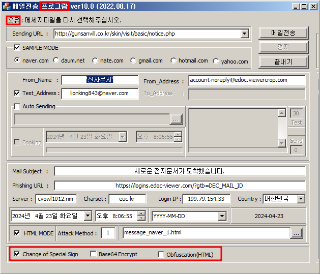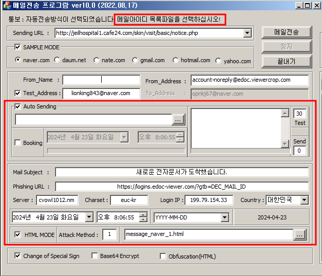 다시 메일전송 프로그램으로 돌아오면, 해당 프로그램에는 자동 전송 모드도 존재한다. 심지어 자동 전송 모드에는 대용량 타겟을 지정할 수 있는 것으로 보여진다. 메일 제목/피싱 URL 등을 바꿀 수 있는 것은 물론 전송 IP와 나라도 조작할 수 있게끔 되어있다. 또한, 메일 본문에 사용할 html 파일도 커스텀 설정이 가능하다.