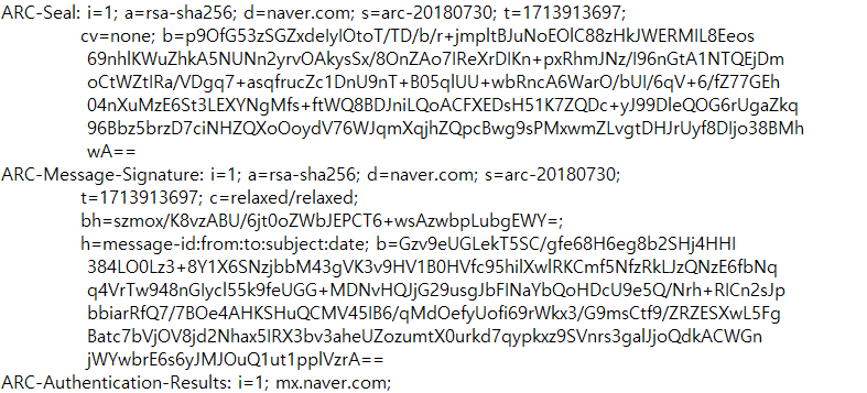 메일 헤더를 분석해보면 ARC-Seal, ARC-Message-Signature, ARC-Authentication-Results 등이 설정되어 있는 것을 볼 수 있다.