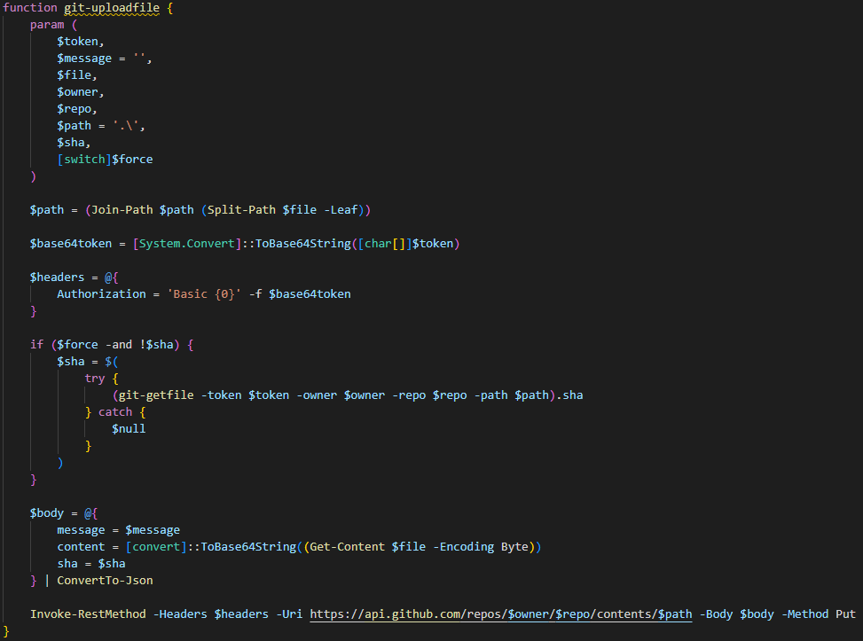 github에 탈취한 정보를 upload 하는 코드는 아래와 같다. 특이점으로는 해당 코드는 github에 공개되어 있는 오픈소스 코드라는 점이다. 이러한 특이점은 Kimsuky 그룹이 악성코드를 개발할 때 오픈소스를 참고한다는 점을 보여준다. 또한, 악성코드 개발 인력의 부족 등을 엿 볼 수 있는 점이기도 하다.