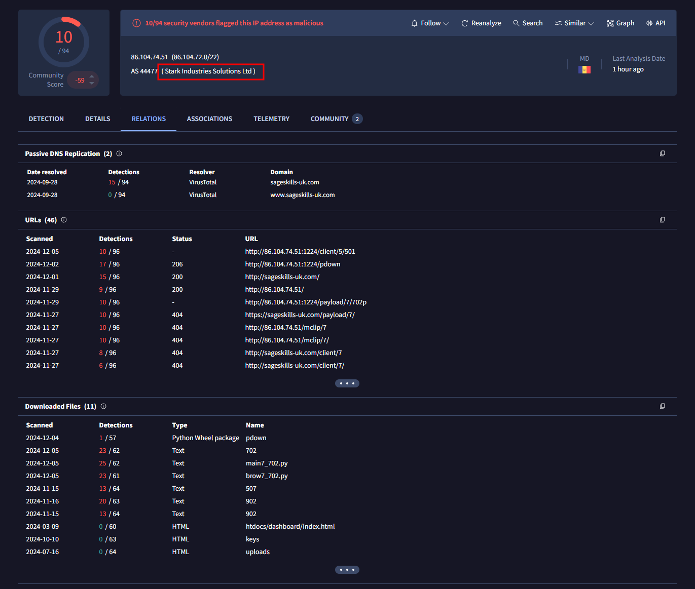 해당 C2 서버의 내역을 살펴보면, 이전의 Beavertail 악성코드와 같이 인터넷 공급자가 Stark Industries Solutions인 것을 볼 수 있다.