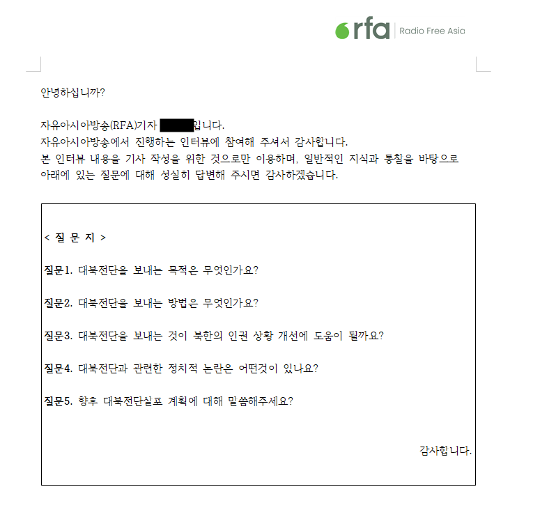 hwp 파일들은 모두 미끼 파일이며 RFA_질문지.hwp 는 암호화 되어 있고, 자유아시아방송 인터뷰 질의서.hwp 는 아래와 같이 작성되어 있다.