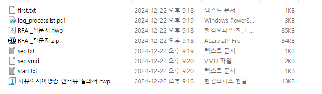 또한, first.txt, log_processlist.ps1, sec.txt, sec.vmd, start.txt 파일들이 존재한다. 각 파일들에 대해 분석한다.