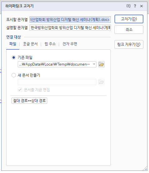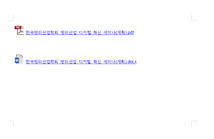 한글 파일 내 링크를 실행할 경우, 위장 pdf 및 위장 docx 파일이 나타난다. 해당 위장 파일은 실제 한국방위산업학회 문서로 보여지며, 공격에 사용하기 위해 인터넷에 공개되어 있는 자료 등을 가져와 사용한 것으로 보여진다.