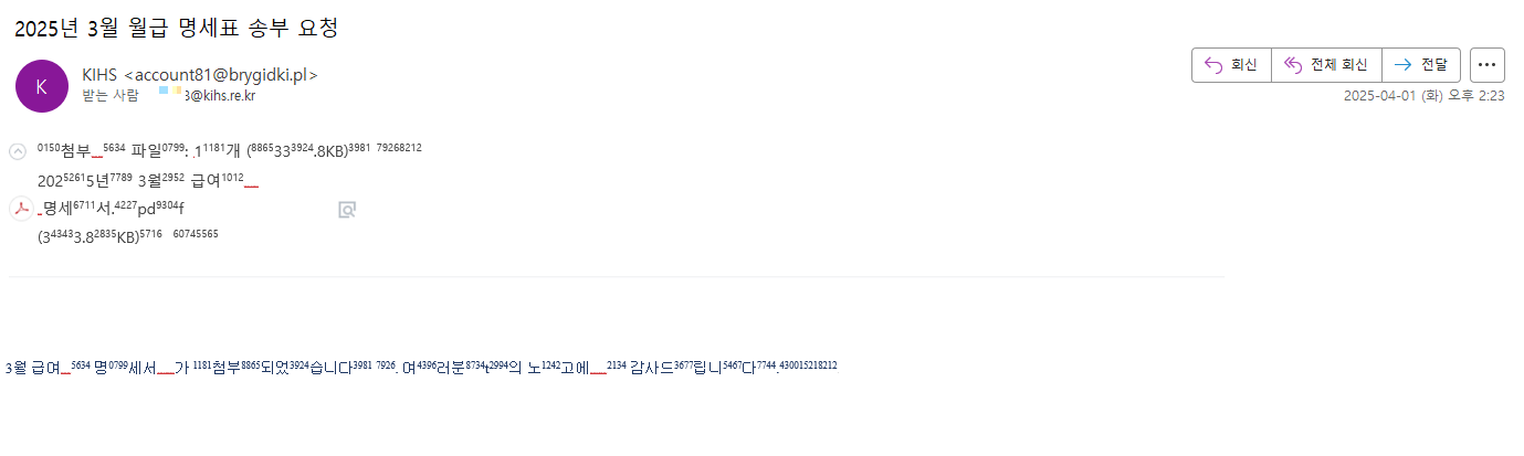 아래는 3월 급여 명세서 위장 메일 화면이다.