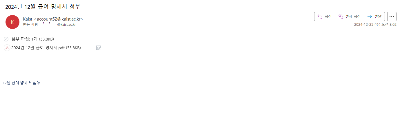 가장 먼저 급여명세서 위장 메일을 포착한 것은 지난 2024년 12월이다. kaist의 한 계정으로 전송된 "2024년 12월 급여 명세서 첨부" 라는 제목의 메일을 확보했다. 보낸 계정은 "account52@kaist.ac.kr" 이며 메일의 내용은 급여 명세서 파일처럼 보이는 하이퍼링크와 "12월 급여 명세서 첨부.."로 구성되어 있다.