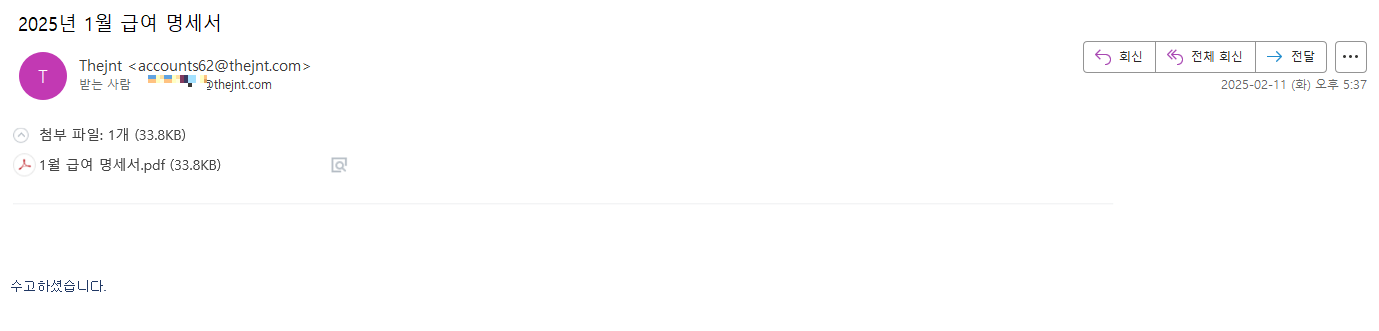 아래는 2월 급여 명세서 위장 메일 화면이다.