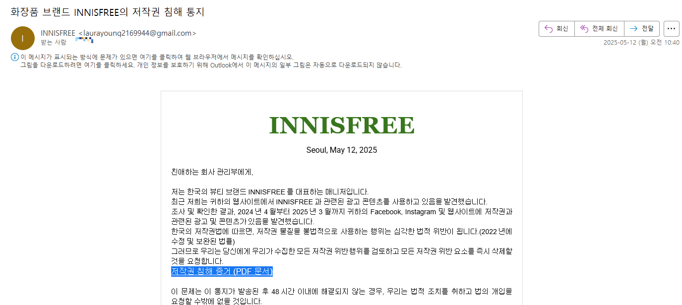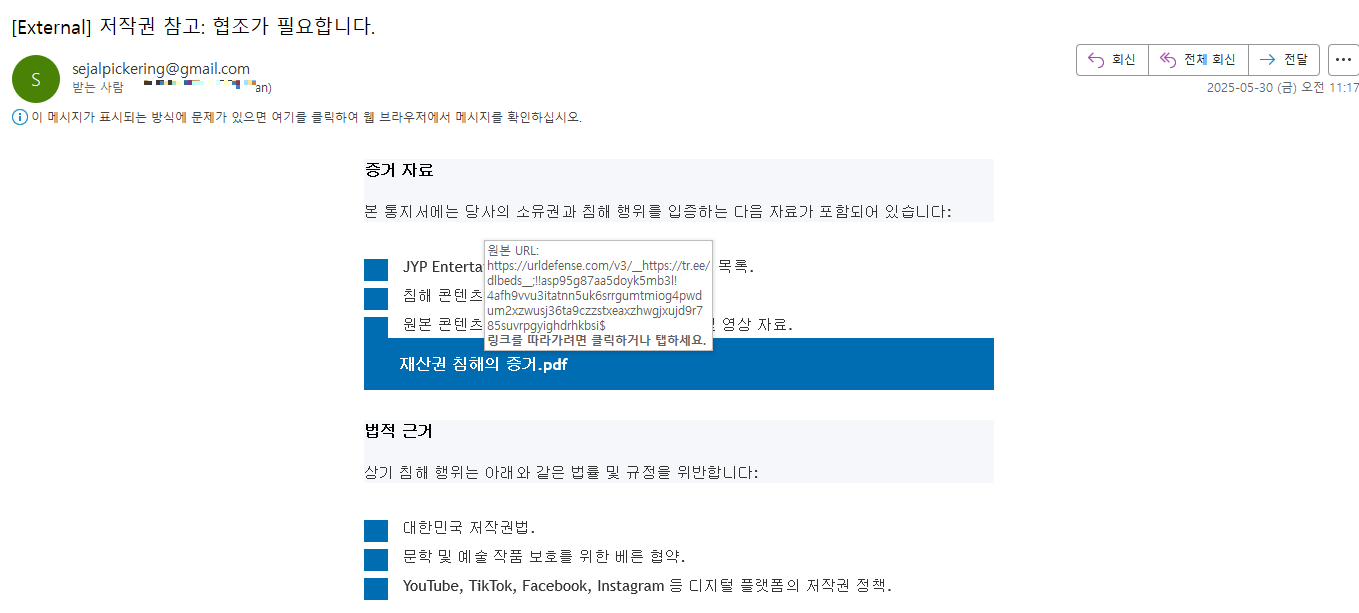 먼저, 스피어피싱 메일은 아래 그림들과 같다. 메일 수신자가 저작권/소유권이 침해하고 있다는 내용으로 작성되어 있고, 관련 문서를 확인하기 위해서는 메일 내 링크를 클릭하도록 유도한다. 링크 클릭 시, 악성코드가 포함되어 있는 압축 파일이 다운로드 되는 형태이다.