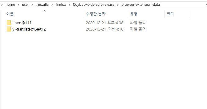 공격자의 파이어폭스 확장 프로그램 내 yi-translate가 설치되었던 흔적이 남아있는 것을 볼 수 있다. 따라서, 공격자는 중국 내에서 사용되는 번역 프로그램을 확장 프로그램으로 사용했던 것으로 보여진다.