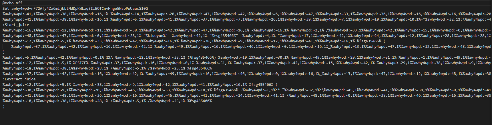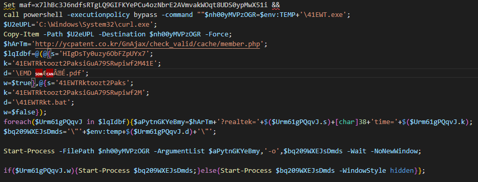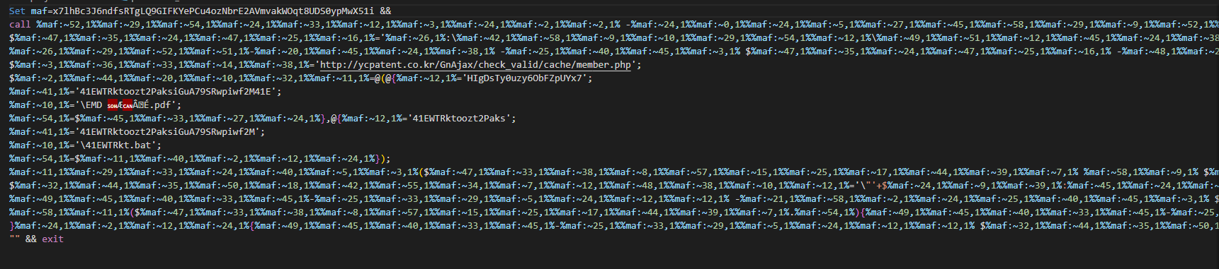 실제 악성행위를 수행하는 파일은 함께 다운로드 되는 bat 파일이다. bat 파일은 아래와 같은 형태를 가지고 있다. lnk 파일과 마찬가지로 변수에 문자열을 할당한 뒤, 변수의 특정 위치를 호출해 코드를 완성하는 형태인 것을 볼 수 있다.