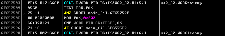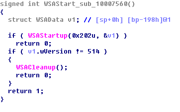 이후 WSAStartup() 함수를 이용해 C&C 서버와 네트워크 연결을 준비하게 된다.