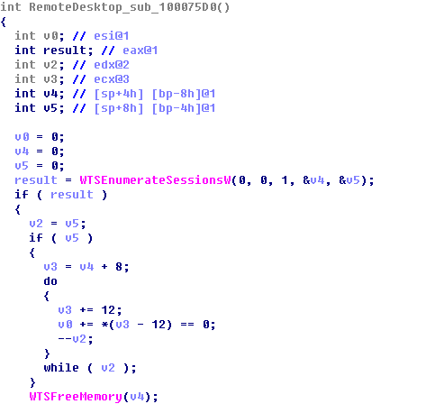 | 중복실행 방지를 위한 뮤텍스 생성 -> C&C 서버 연결을 위한 네트워크 연결 초기화 -> C&C 서버와 연결 후 명령 대기 -> 감염 PC의 원격 데스크톱 정보 등을 탈취 |