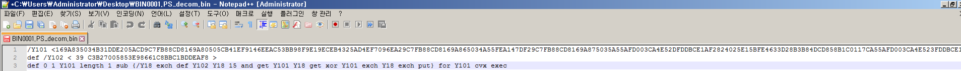 다운로드 된 악성코드 파일에서 xor 디코딩에 쓰이는 헥스 값은 아래와 같다.