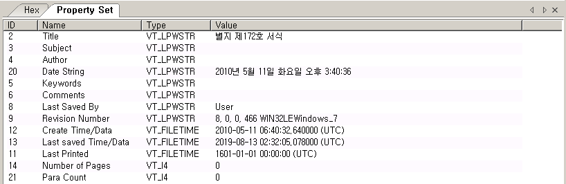 먼저 국세청 문서로 위장한 악성코드는 "별지 제 172호 서식"이라는 타이틀을 가지며 "User"라는 사용자 명으로 최종 저장한 것으로 나타난다. 해당 악성코드는 이전 한글 파일을 이용해 악성코드를 유포하던 방식과 같이 EPS(Encapsulated Post Script)를 이용해 악성코드를 유포하며, 실제 악성코드 안에 PS 파일이 존재한다. PS 파일에는 드로퍼 역할을 수행하는 코드가 인코딩 되어 있으며 특정 값을 이용해 xor 디코딩을 진행하면 실제 코드가 복호화된다.