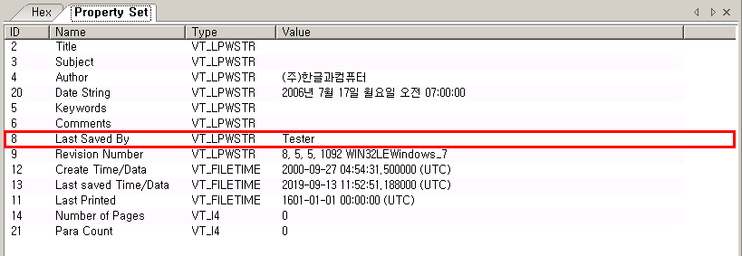 악성코드는 한글 악성코드이다. 최종 저장자는 'Tester' 라고 저장되어있는걸 확인할 수 있다.