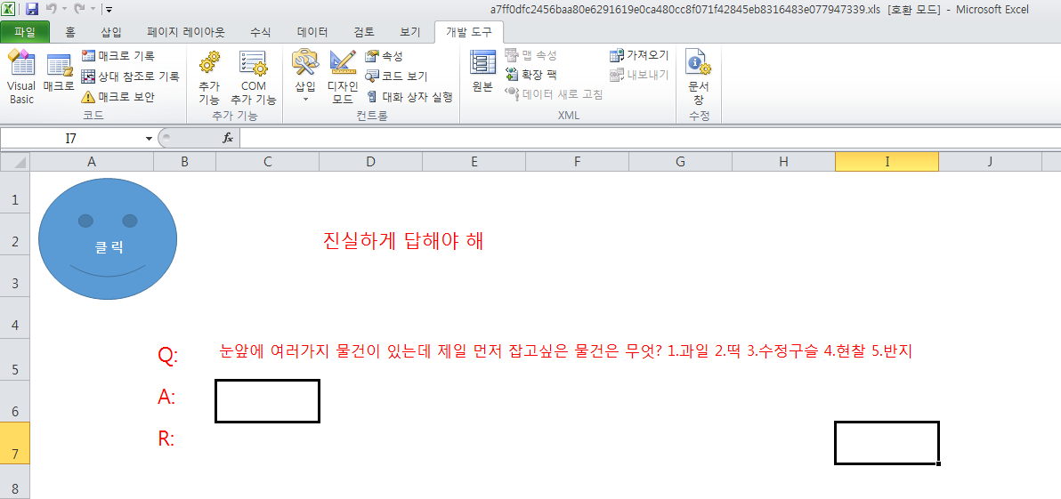 xls 문서를 실행하게 되면 아래와 같은 화면을 볼 수 있다. 클릭 부분이 존재하고, "진실하게 답해야 해" 라는 문구가 보인다. 하지만 이 화면에서는 특별할 것이 없고, 파일을 열고 매크로 사용을 클릭한 순간 환경 백그라운드에서는 악성 매크로가 동작하면서 파워쉘 파일을 드롭한다.