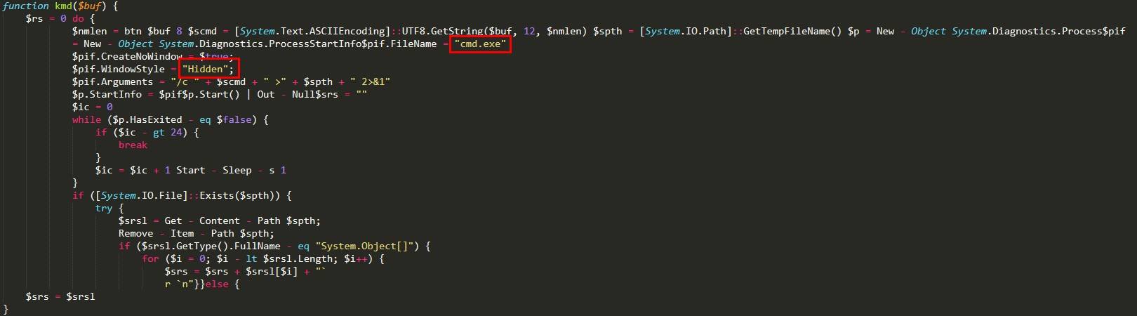 윈도우 환경의 경우 아래 코드를 수행한다. 파워쉘 파일인 ps 파일을 실행 환경의 %TEMP% 폴더 아래에 랜덤한 이름을 갖고 드롭한다. 이후, 파워쉘을 실행 정책과 관계없이(우회해서) 실행시켜 드롭한 파워쉘 파일을 실행시킨다.