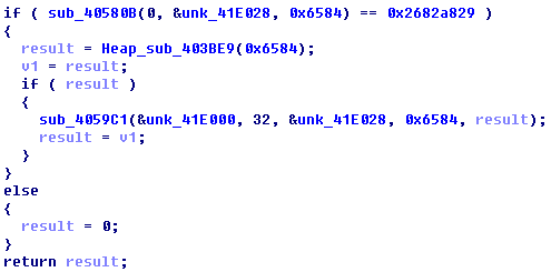 이후에 파일 내부 오프셋 값과 0x6584, 0x0을 인자로 하나의 함수에서 and 연산과 xor 연산을 거쳐서 값을 받고, 해당 값이 0x2682a829와 일치하는지를 검사한다. 이 체크루틴은 이후에 있을 두 개의 메인 역할을 하는 함수로 갈지를 결정한다.