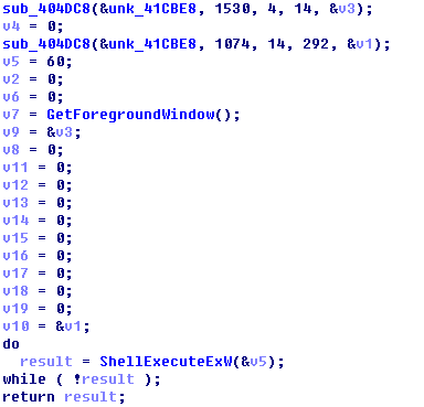 ShellExecute 함수를 이용해서 섀도우 카피본 삭제도 시도한다.